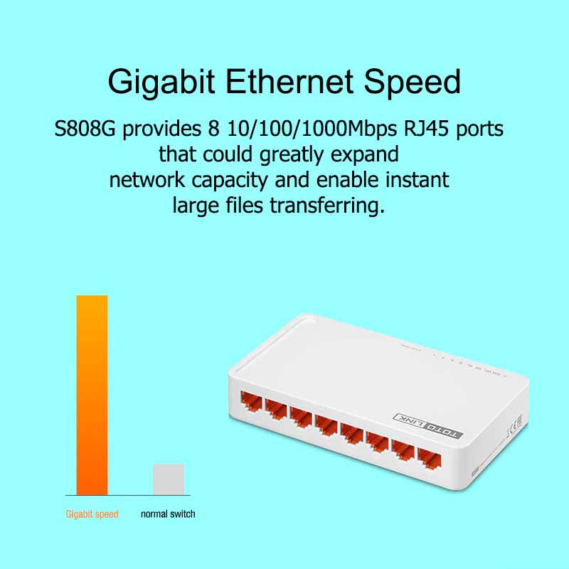 شبكة إيثرنت GIGABIT ذات 8 منافذ - ثمانية (8) منافذ RJ45 للتفاوض التلقائي بسرعة 10/1000 ميجابت في الثانية تعمل على توسيع سعة الشبكة بشكل كبير