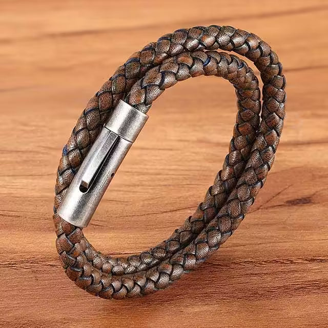 سوار جلدي مزدوج الطبقات للرجال بمشبك فضي (EGBT090)